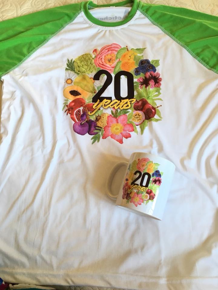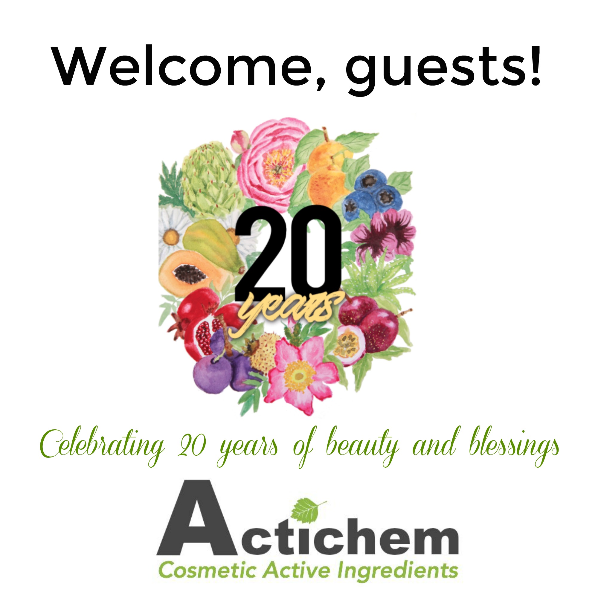 Actichem’s 20th anniversary logo. The wreath, which was painted by yours truly in watercolor, is made up of most of Actichem’s natural active ingredients, the fruits and flowers contained in the products.
