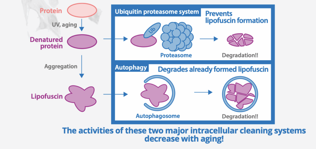 The more there is internal reflected light from the skin, the brighter and more attractive the skin appears. To achieve this, the formation of lipofuscin must be prevented and the lipofuscin deposits that have accumulated must be removed or reduced.