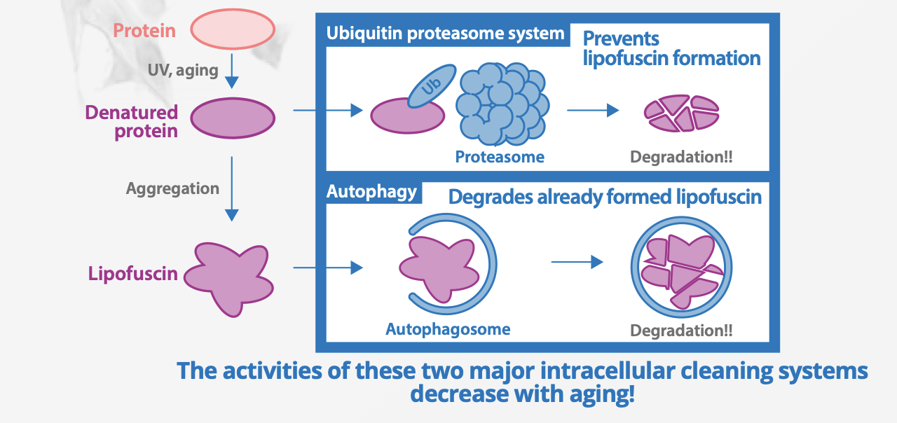 Autophagy is a cellular process that clears cellular waste and damaged components. By removing damaged proteins and organelles like lipofuscin, autophagy contributes to keratinocyte differentiation including regulating pigmentation, maintaining skin barrier and overall skin health and function.